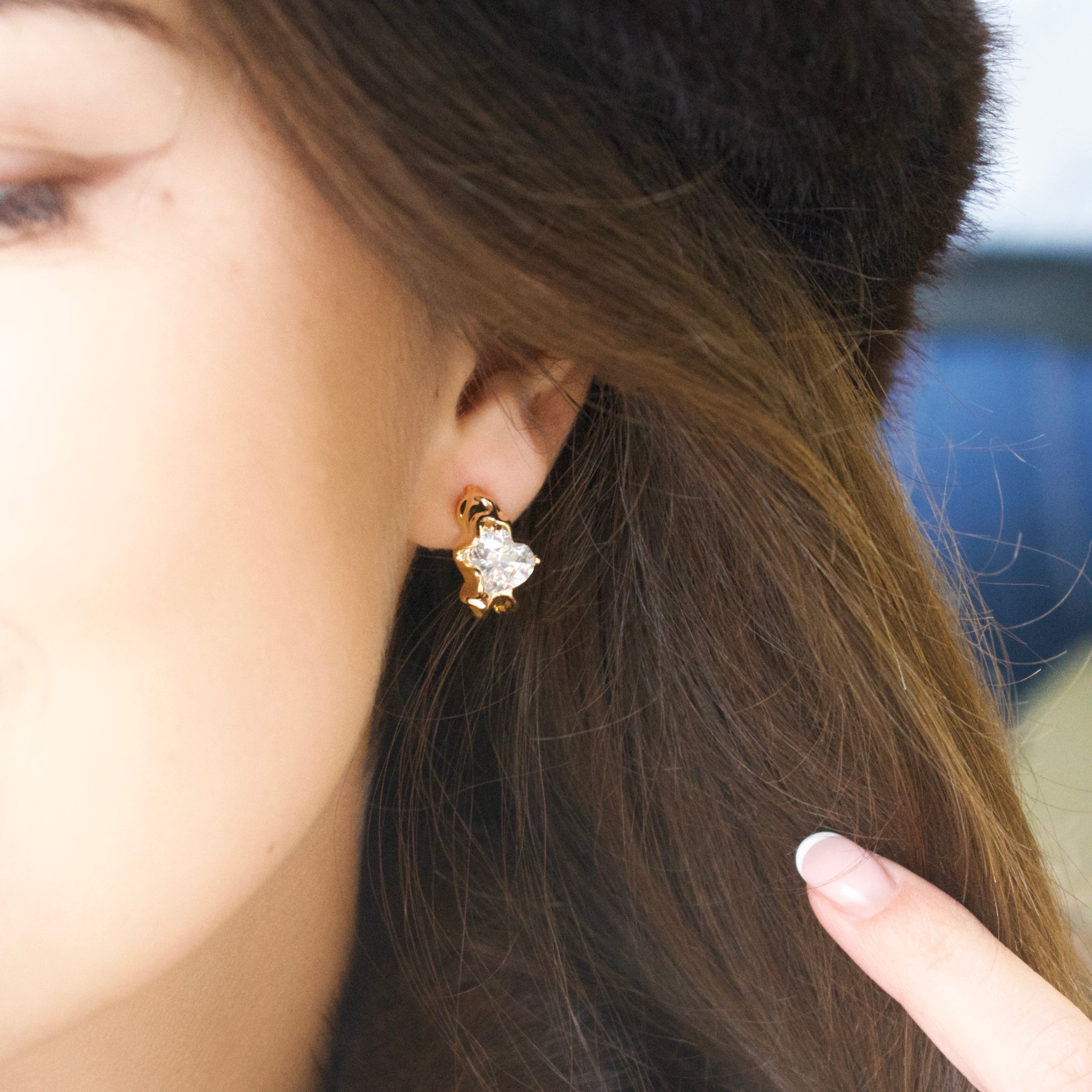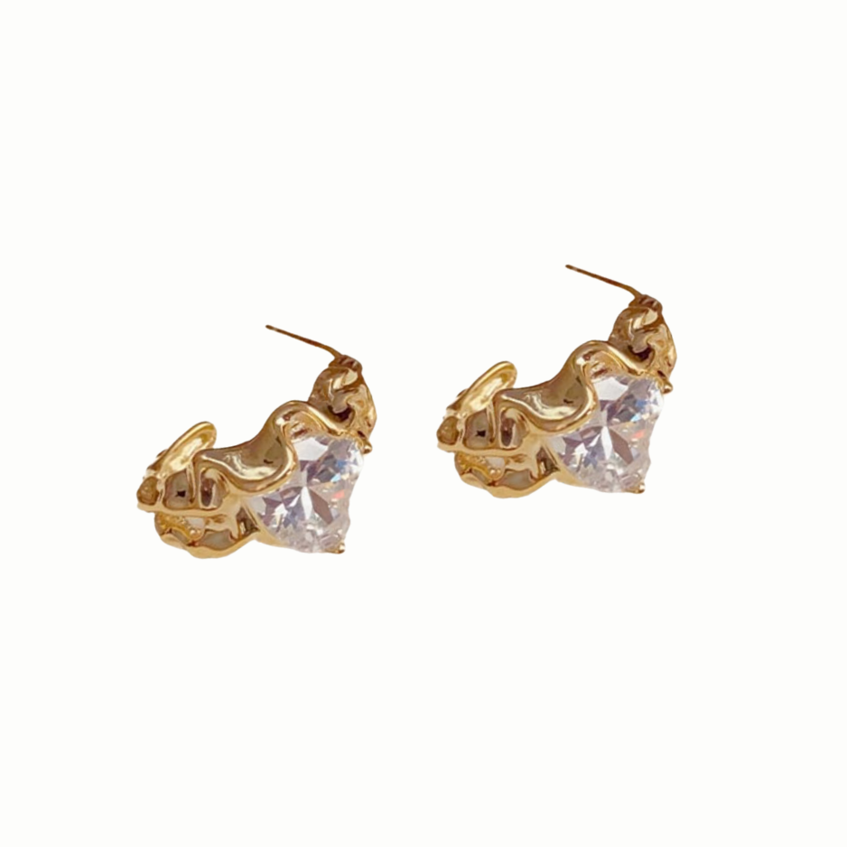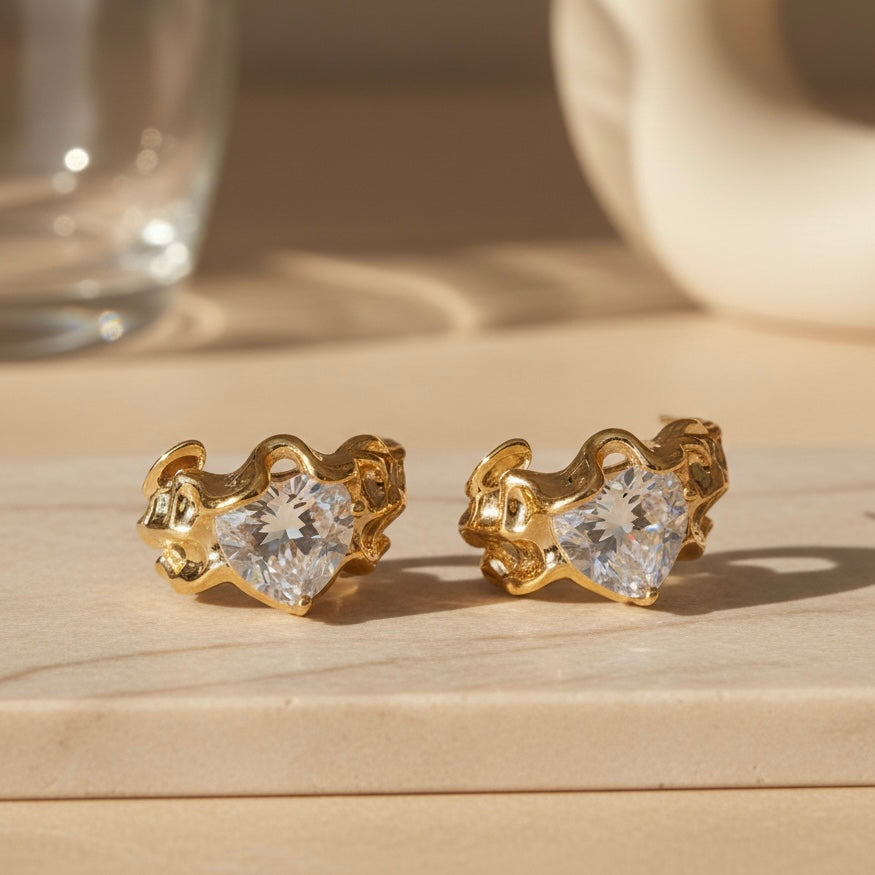 Posebni asimetrični uhani v obliki srca iz medenine, prevlečene s 14k zlatom, okrašeni z bleščečimi kubičnimi cirkoni. Elegantni, unikatni in ustvarjeni za izstopanje. Na voljo z zlatim ali srebrnim kristalom za osebni pridih.